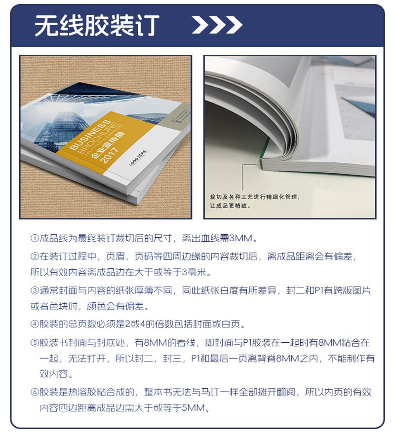 無(wú)線膠裝:將書脊處打毛,用熱熔膠將書貼粘在一起。